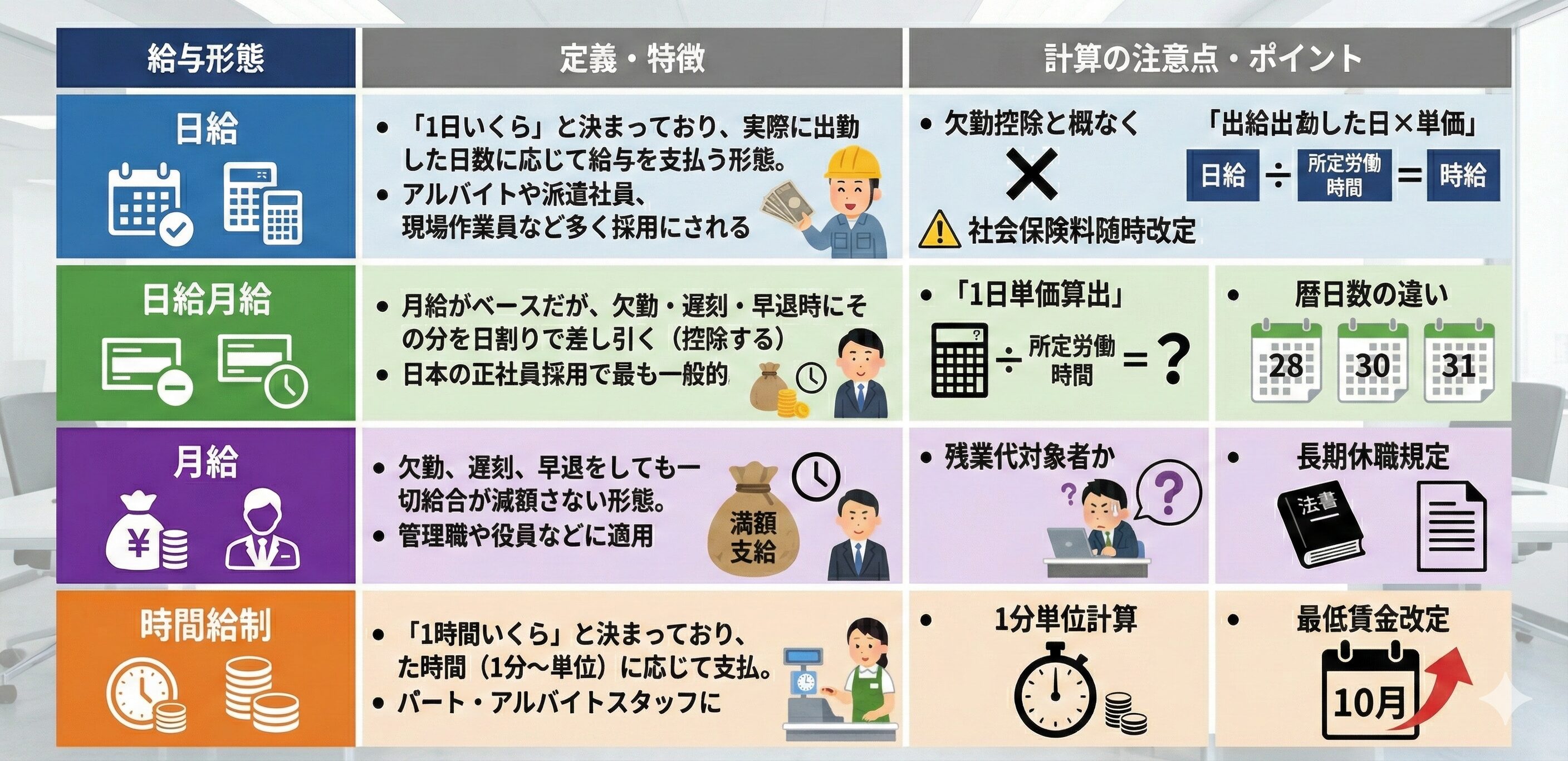 ・計算の注意点:控除の計算が必要ないため事務負担は軽いですが、その分「残業代を支払う必要がある対象者か」という法的区別を正確に行う必要があります。